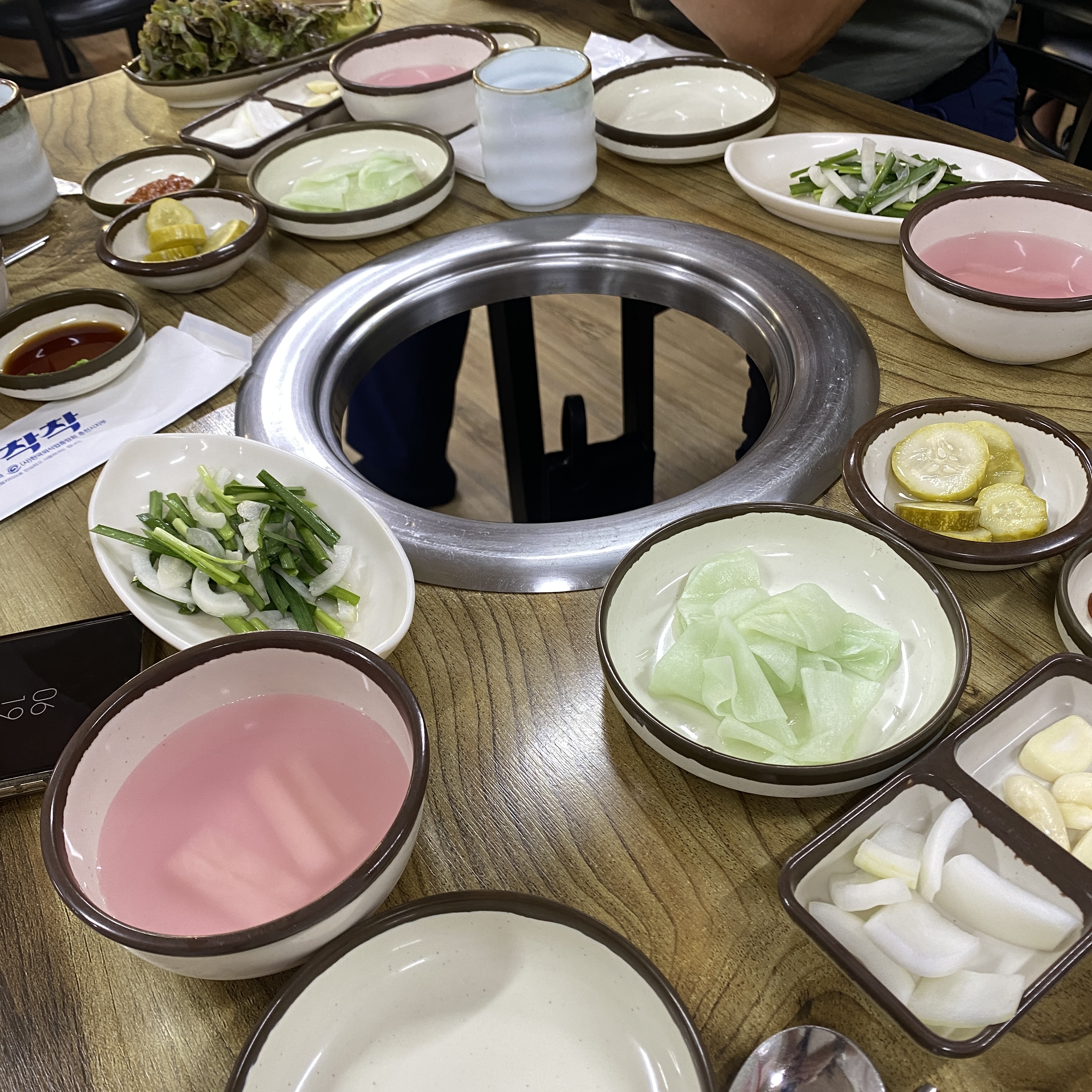 핑크 동치미 국물과 쌈무, 부추, 피클 등 닭갈비와 어울릴 수 밖에 없는 선수들이다. 동치미 국물은 조금 더 시원~ 했으면 더 좋았겠다. 여름이니까! 고마 얼음 동동 띠아주이소! 🧊🧊