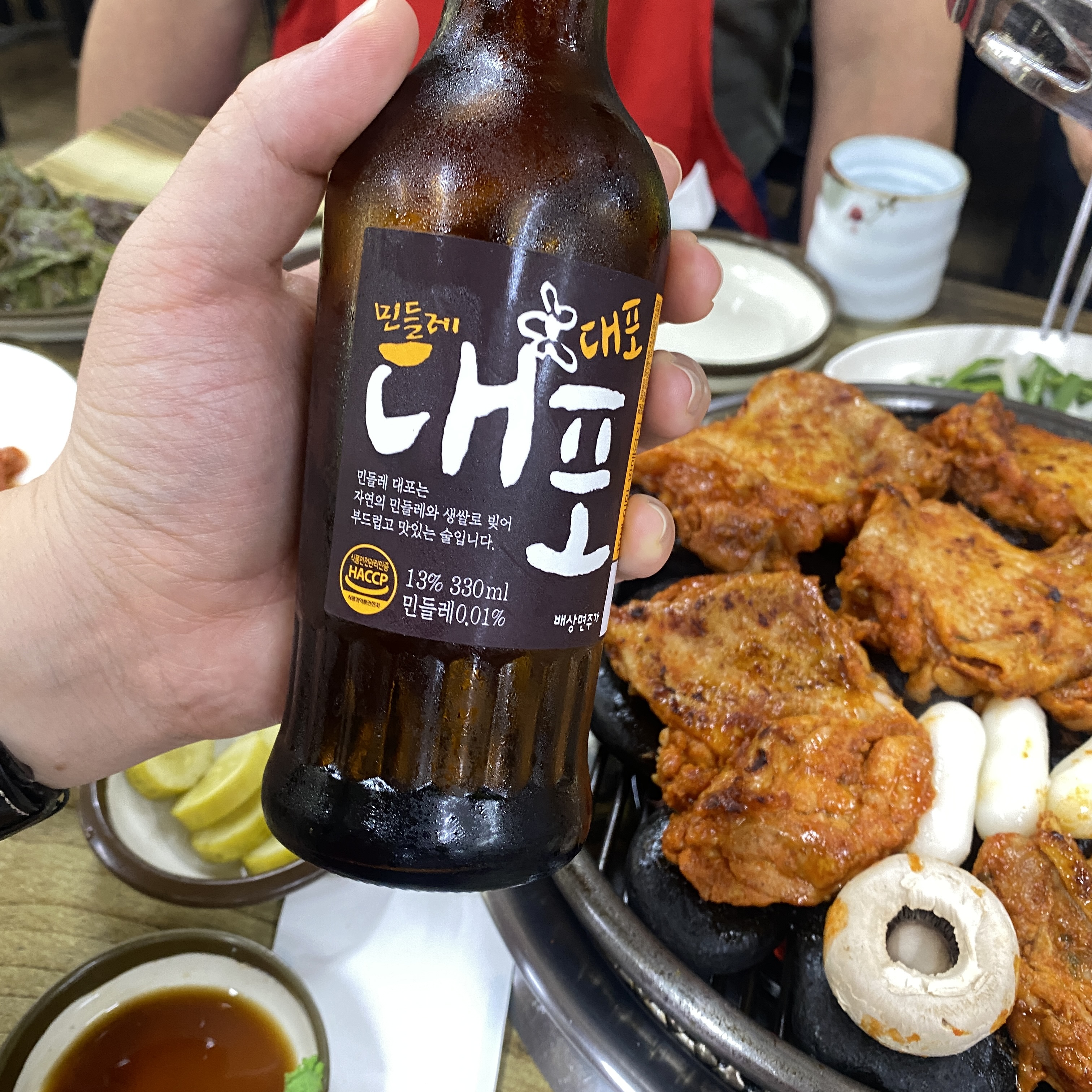 민들레 대포라는 술을 팔길래 궁금하여 시켜봤다. 백세주 같은 느낌에 민들레 향이 살짝 난다. 나쁘지는 않은데 뭐 계속 시키지는 않았다. 역시 닭갈비에는 소맥이 진리 아닐까? 그냥 내가 소맥을 좋아하는 건가.. 개인적으로 소주1 : 맥주2 를 좋아한다는 건 TMI 겠지?