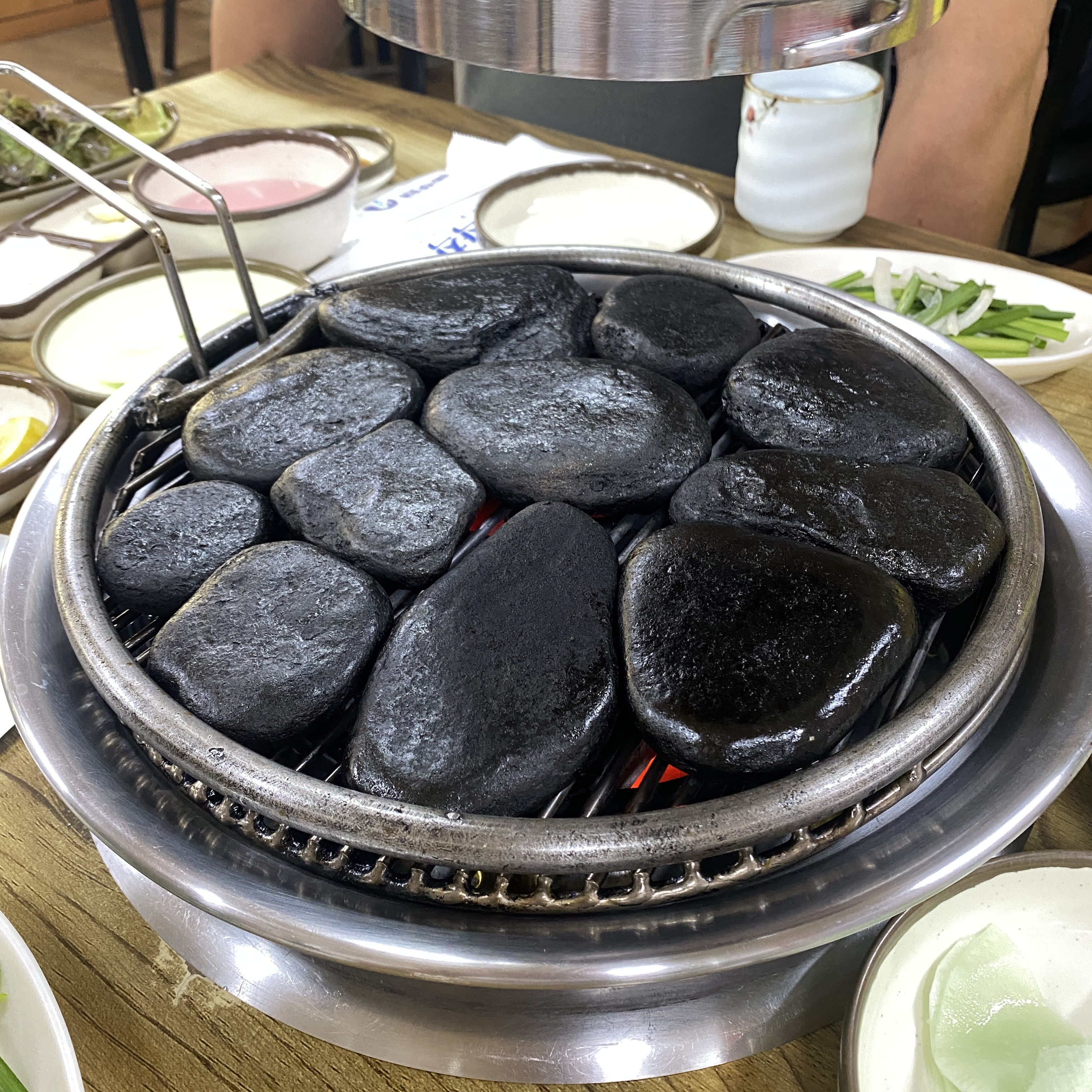 돌이 이미 데워져서 오기 때문에 돌 때문에 굽는데 오래 걸리거나 하지는 않는다. 가운데가 불이 세기 때문에 돌아가면서 가운데 자리로 옮겨주면 구우면 된다. 실제로 확실히 타지 않고 다 익은 고기고 바깥쪽으로 옮겨놓으니 식지도 않고 계속 따듯하게 먹을 수 있어 좋았다.